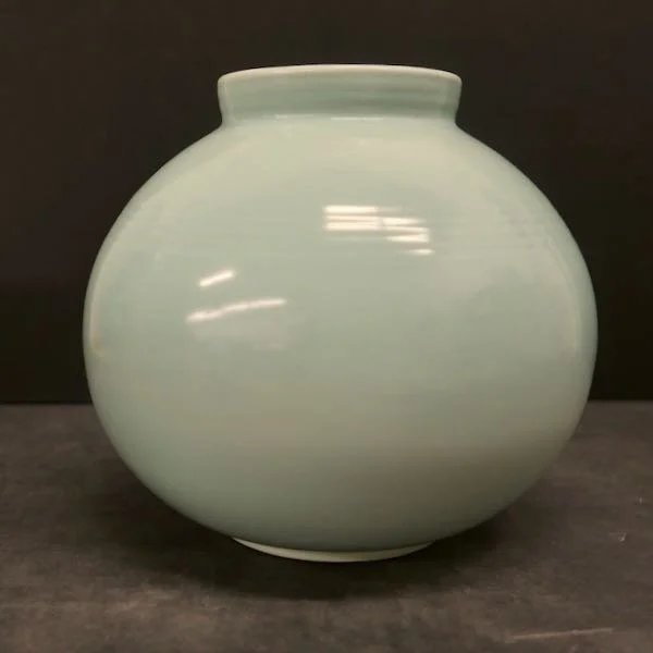 Vintage round vase is called Rose Bowl by the talented Hamilton sisters. They contributed a stunning body of work during their brief time with Vernon Kilns. This piece has soft mint-green glaze.