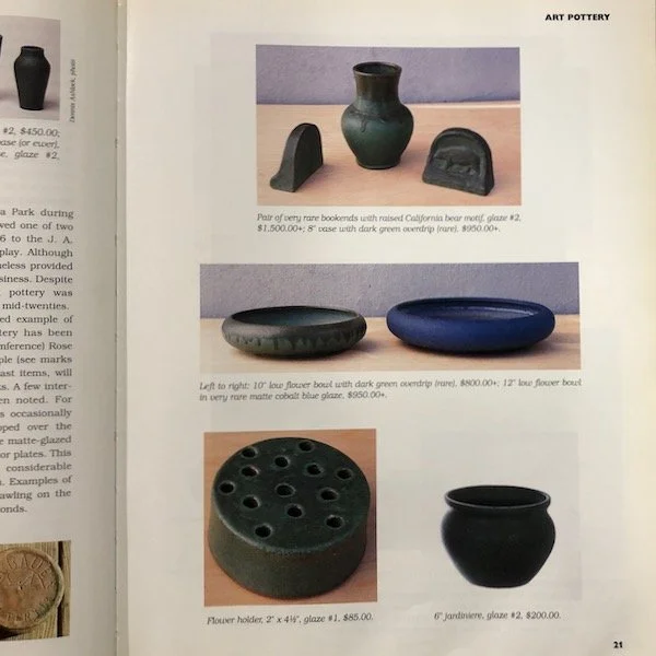 Categories: All Tile American Tile American Encaustic AETC Empire Enfield Flint Faience Franklin Grueby Hamilton J & JG Low Kensington Marblehead Moravian Mosaic Tile Owens Paul Revere Pewabic Providential Rookwood Rossman Russel Crook San Jose Mission Standard Trent U S Encaustic University of North Dakota Van Briggle Weller Wheatley Wheeling California Tile Alhabra Kilns American Encaustic AETC Batchelder Brayton Laguna Calco California Art Tile California China Products California Faience Catalina Claycraft D & M Decorative Arts Gladding McBean Handcraft Hispano-Moresque Howard Whalen Kraftile Malibu Markoff Muresque Pacific Tile & Porcelain Polia Pillin Pomona Santa Monica Brick Solon & Schemmel Spanish Pottery & Tile Taylor Tropico Tudor Walrich Woolenius Field Tile AETCO Batchelder Calco California Art Tile Claycraft Gladding McBean Grueby Malibu Mosaic Tropico Tunisian Foreign Tile Dutch English French Italian Japanese Mexican Portuguese Spanish Tunisian Pottery American Pottery Brush Dedham Fulper Galloway Grueby Harding Black Marblehead Merrimac Newcomb College Pewabic Rookwood Roseville Rose Cabot Paul Revere San Jose Mission Saturday Evening Girls Teco University of North Dakota Van Briggle Walley Weller Zanesville Stoneware California Pottery Arequipa Bauer Brayton Laguna Calco California Faience Catalina F. H. Robertson Garden City Glen Lukens Hillside Italian Terra Cotta La Canada Malibu McAfee Muresque Pacific Clay Products Paul Czirban Polia Pillin Rembrant Laguna Robertson of Hollywood Solon & Schemmel Tudor Vernon Kilns Walrich Washburn Miscellaneous Shop All | Tile | Pottery | Miscellaneous | Quick View Vintage Garden City Rose Bowls Blue from $250.00 Quick View Pewabic Vintage Bird Tile $190.00 Quick View Individual Baker by Garden City Pottery $75.00 Quick View Floral Border Stretcher Tiles by Malibu $50.00 Quick View Floral Border Cap Tiles by Malibu $40.00 Quick View Claycraft Scenic Tile $125.00 Quick View Claycraft Cottage Tile $125.00 Quick View Bauer 12" Vintage Oil Jar Delft Blue $1,300.00 Quick View Bauer 12" Vintage Oil Jar Cobalt $1,200.00 Quick View Taylor Vintage Decorated Tiles $65.00 Quick View Bauer Carnation Jar by Matt Carlton $500.00 Quick View Vintage Nappies by Garden City Pottery from $40.00 Quick View Garden City Diamond Pattern Cups/Saucers $65.00 Quick View Vintage Malibu Tile Odd Shape $500.00 Quick View Bauer #10 Plant Saucer $125.00 Quick View Bauer #8 Plant Saucer $125.00 Quick View Bauer #6 Plant Saucers $95.00 Quick View Bauer #5 Plant Saucers $75.00 Quick View Bauer 16" Vintage Oil Jar Delft Blue $1,700.00 Quick View Bauer 16" Vintage Oil Jar Yellow $1,600.00 Quick View Grueby Antique Monk Tile $650.00 Quick View Large Scenic Tile by California Art Tile Co. $2,500.00 Quick View Scenic Cal Art Tiles Framed $750.00 Quick View Raised-Line Vintage Malibu Tiles $125.00 Quick View Calco Raised-Line Tiles $100.00 Quick View Floral Tile by Calco $150.00 Quick View Calco Vintage Floral Tile $165.00 Quick View Calco Cuenca Tiles $150.00 Quick View Vintage Floral Tile by Calco $165.00 Quick View Calco Tile with Tunisian Design $175.00 Quick View Vintage Mayan Face Tiles by Calco $800.00 Quick View Vintage Calco Mayan Face Tile $650.00 Quick View Floral Tiles from California Art $150.00 Quick View California Art Floral Polychrome Tile $200.00 Quick View Bauer RARE Low Bowl $750.00 Quick View Calco Large Round Decorated Tile $1,800.00 Quick View Bauer Fred Johnson Stock Vase $600.00 Quick View Bauer Vintage Lion Pot #10 $1,500.00 Quick View CALCO RARE Polychrome Single Sconce (Light) $3,500.00 Quick View CALCO RARE Polychrome Single Sconce (Dark) $3,500.00 Quick View RARE CALCO Polychrome Double Sconce $4,500.00 Quick View Bauer Vintage Hanging Basket $300.00 Quick View Malibu Miniature Tiles with Mayan Face Version 2 $100.00 Quick View Malibu Miniature Tiles with Mayan Face Version 1 $100.00 Quick View Vintage Malibu "Rug" Tile Set $300.00 Quick View Calco 4-Tile Interlocking Set $1,500.00 Quick View Bauer Tall Ruffled-Rim Vase by Matt Carlton $1,000.00 Quick View Bauer Crimped Fan Vase Cobalt $900.00 Quick View Bauer Crimped Fan Vase Orange $700.00 Quick View Calco RARE Tile with Griffins $695.00 Quick View Malibu Tile Mayan-Themed $400.00 Quick View Malibu Vertical Mayan-Themed Tile $600.00 Quick View Malibu Mayan-Themed Tile $1,600.00 Quick View Malibu Mayan Tiles from $400.00 Quick View Calco Border Tile Floral $125.00 Quick View Decorated Vintage Malibu Tile $150.00 Quick View Malibu Floral/Geometric Vintage Tile $175.00 Quick View Floral Tile by Malibu $150.00 Quick View Malibu Tile with Parrots $900.00 Quick View Malibu Grape Vine Tile $900.00 Quick View Gladding McBean Tiles Moorish Star $100.00 Quick View Large Malibu Peacock Tile $3,000.00 Quick View Malibu Polychrome Tile with Peacocks $1,800.00 Quick View Pacific Pottery Divided Bowl $85.00 Quick View Brayton Laguna Ship Tile $650.00 Quick View Calco Round Tile with Shield $150.00 Quick View Bauer Ruffled-Rim Vase by Matt Carlton $500.00 Quick View Pacific Saucer Assortment 6" $65.00 Quick View Pacific Vintage Dessert Plate Assortment 6" $75.00 Quick View Pacific Vintage Green Salad Plate Assortment 8" $95.00 Quick View Pacific Vintage Salad Plate Assortment 8" $95.00 Quick View Pacific Salad Plate Assortment 8" $95.00 Quick View Pacific Orange Plaid Salad Plate Assortment 8" $95.00 Quick View Pacific Green Plaid Salad Plate Assortment 8" $95.00 Quick View Claycraft Vintage Fireplace Surround $2,000.00 Quick View Claycraft Fireplace Surround $1,500.00 Quick View Pacific Lunch Plate Assortment 8" $160.00 Quick View Pacific Orange Lunch Plate Assortment 9" $160.00 Quick View Pacific Tan Lunch Plate Assortment 9" $160.00 Quick View Pacific Cobalt Blue Lunch Plate Assortment 9" $160.00 Quick View Pacific Pottery #667 Individual Vegetable Bowls $65.00 Quick View Bauer Swirl Flower Pot #10 WWII Green $175.00 Quick View Bauer Swirl Flower Pot #8 $150.00 Quick View Pacific Yellow Dinner Plate A